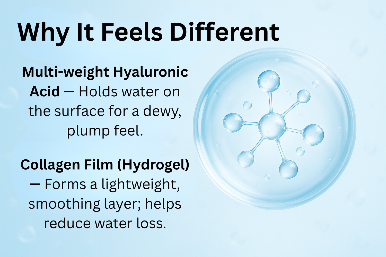 Experience the science of timeless beauty. Our dual-action formula blends low molecular hyaluronic acid to deeply hydrate and bio-collagen to firm and lift — giving your skin that dewy, post-facial glow after every use.