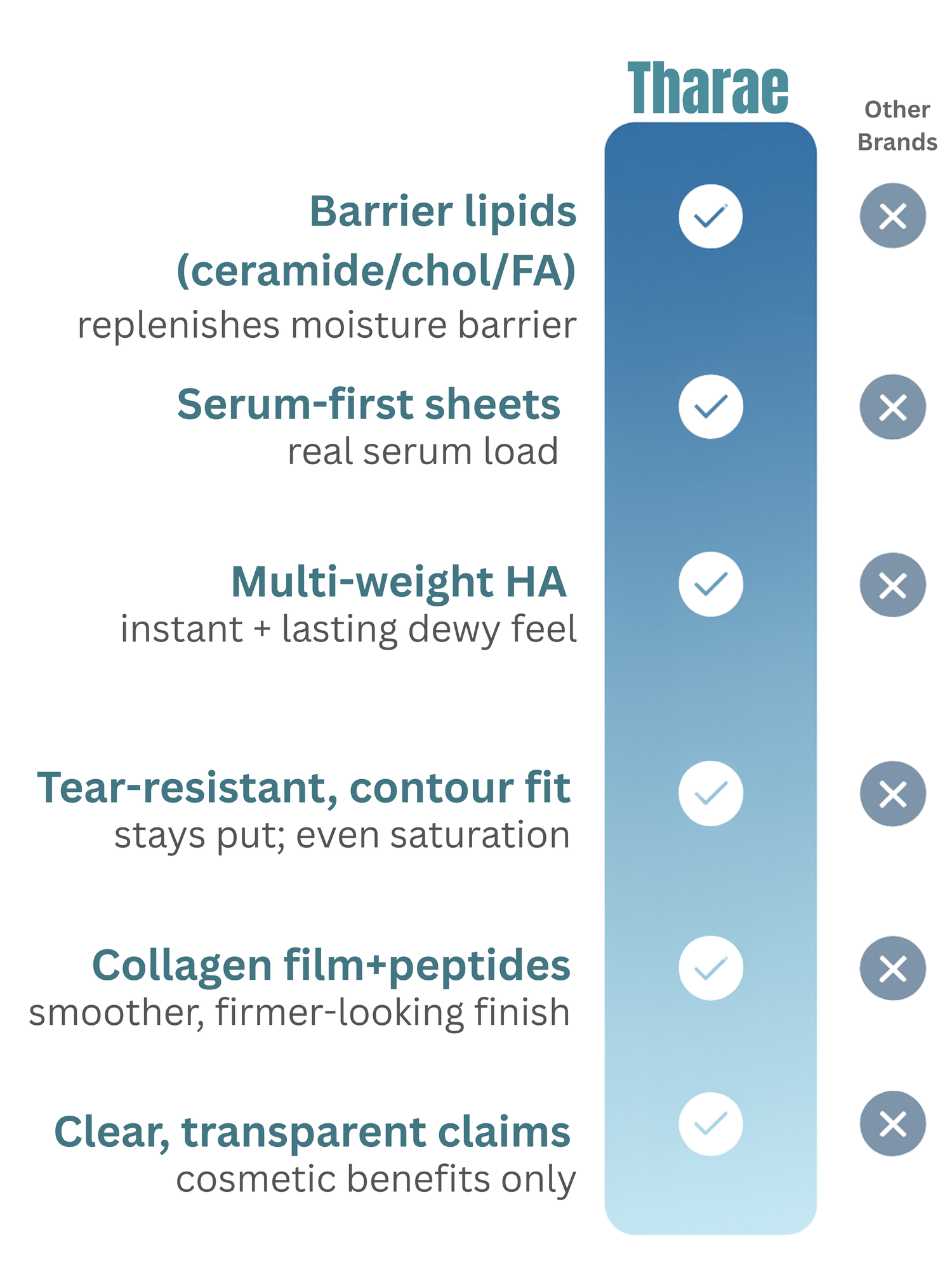 A next-generation hydrogel mask powered by collagen, multi-weight hyaluronic acid, and niacinamide for instantly dewy, firmer-looking skin. Unlike scented-water masks, Tharae’s Serum-First Collagen System delivers active hydration that adheres comfortably to the skin—no sting, no slip, no sticky film. Each use deeply replenishes moisture, smooths texture, and restores barrier balance for a calm, radiant finish.